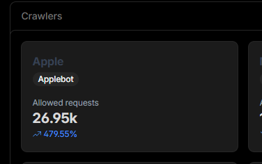 Applebot loves YouTubeTranscript.dev 🤖 Our Cloudflare dashboard just caught something interesting: Applebot sent 26.95k requests last period. That's a 479.55% spike. AI crawlers overall hit 31.4k requests (152% up from before), but Apple's indexing our transcripts harder than anyone else. They're clearly building something with search and AI in mind.
