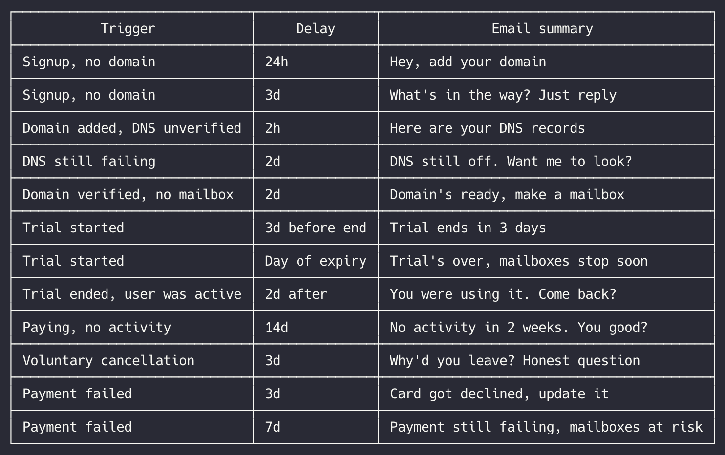 Today on Shipmail was about email automation. Trying to help users who get stuck at different steps, onboarding, after buying or importing a domain, creating a mailbox, sending the first email, etc. Set up a full set of emails triggered by events and timing. Everything is custom, no external tools, that's the cool thing of owning your email infra 🙂