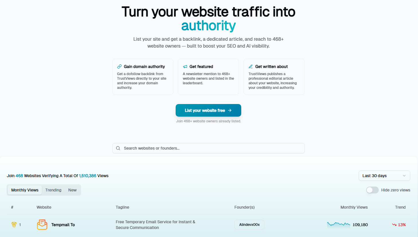 TrustViews· 8h468 websites listed 1,500,000 views tracked It had zero revenue. Reason? Because we never added a paywall. 🫣 > Most indie projects die from that exact mistake. So I added a paid tier to TrustViews live now. It's a directory model about SEO & get visibility. > get a dofollow backlink > newsletter mention to 450+ people > articles written about your site.