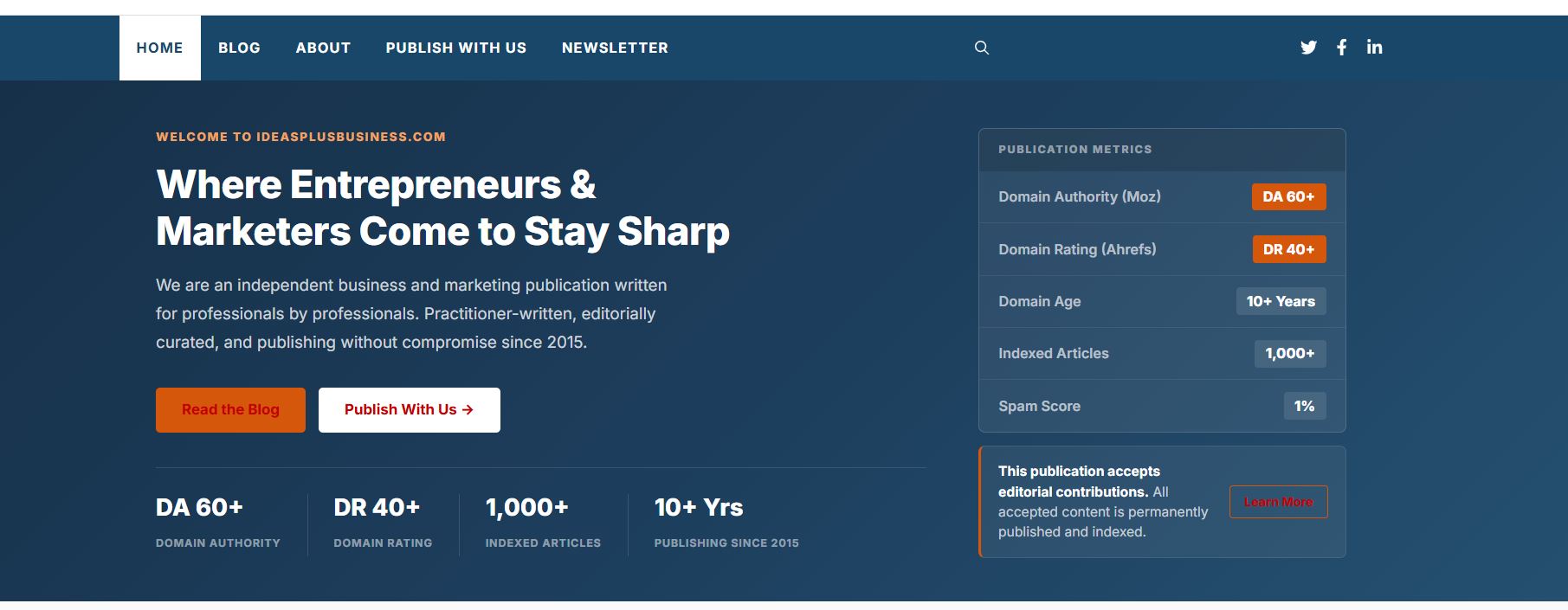 IdeasPlusBusiness.com is an established digital publication focused on entrepreneurship, small business strategy, startups, and growth insights. The platform features evergreen, search-optimized content with strong relevance for founders, business professionals, and digital entrepreneurs, making it well-positioned for organic traffic, authority building, and monetization through ads, sponsorships, or lead generation. It’s a scalable asset for anyone looking to own a credible business.