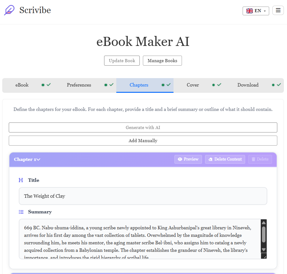 ENGINE PROMPTS V2 Scrivibe has been updated with new content generation prompts to improve the continuity between chapters and keeps the arc of characters and situations along the book, very useful for non-fiction genres particularly. Now, it can generate a medium book (200-300 pages) in less of an hour, cover included, and download the final doc ready to publish in amazon KDP, adding some useful sections as credits, author's note or bibliography. The tool offers some tokens free to test it and complete a few chapters to check the quality of content and decide if it's enough for your porpouse without spent money. If you're happy with what you are read just only need to by a small token package (<$10) to generate a complete ebook ready to publish.